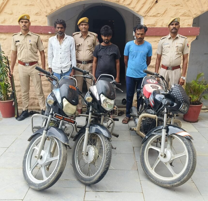 चोरी की मोटर साईकिल खरीदने वाले सरगना सहित तीन आरोपी गिरफ्तार, तीन मोटर साईकिले बरामद।