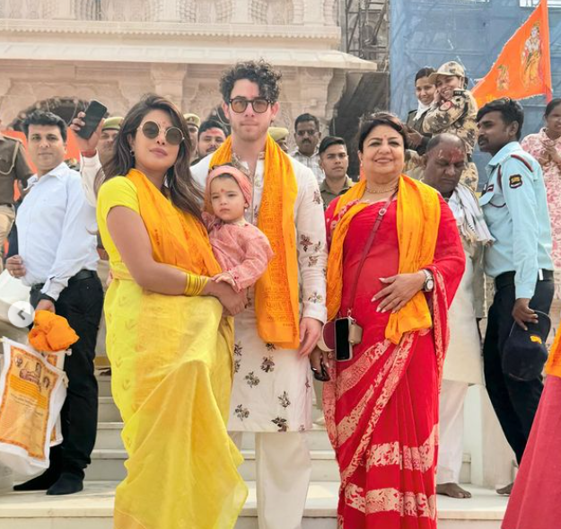 प्रियंका चोपड़ा (Priyanka Chopra Photos) ने अयोध्या से लौटने के बाद देर रात राम मंदिर की तस्वीरें अपने ऑफिशियल इंस्टाग्राम अकाउंट पर शेयर की हैं. पहली तस्वीर में प्रियंका पीली साड़ी में अपनी बेटी को गोद में उठाए, रामलाल के दर्शन करती दिख रही हैं. दूसरी तस्वीर में प्रियंका-निक प्रभु श्रीराम के साथ फोटो क्लिक करा रहे हैं, तो तीसरी फोटो में प्रियंका (Priyanka Chopra Daughter) की बेटी मालती हाथ जोड़े दिखाई दे रही हैं. फिर अगली तस्वीर में प्रियंका मंदिर के बाहर बेटी मालती, पति निक और मां मधु चोपड़ा के साथ कैमरा के लिए पोज कर रही हैं.
