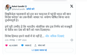 भारतीय महिला रेसलर विनेश फोगाट (Vinesh Phogat Disqualified) को ओवरवेट के कारण अयोग्य घोषित कर दिया गया है. इस खबर ने पूरे देश को गमगीन कर दिया है. विनेश को फाइनल मुकाबले के लिए अयोग्य घोषित किए जाने पर कांग्रेस सांसद राहुल गांधी ने दुख प्रकट किया है.